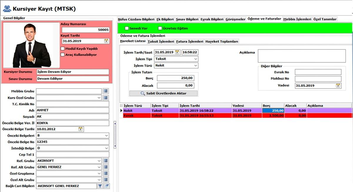 - Kursiyer taksit bilgileri ve raporlamalarını yapabilir,